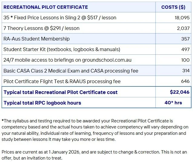 The syllabus includes sufficient flying for a typical part-time student to develop into a well-rounded pilot. Fixed price lessons allow you to budget and you have the flexibility to complete the Training Program at your pace. You can commence your Recreational Pilot Certificate Training Program at any time, but you must be at least 15 years of age to fly solo and complete your RPC.